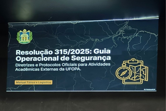 Na manhã do dia 09 de abril de 2026, foi realizada uma atividade informativa sobre a Resolução CONSUN nº 315, de 26 de março de 2025, que estabelece normas e protocolos de segurança para atividades acadêmicas externas aos campi da UFOPA.